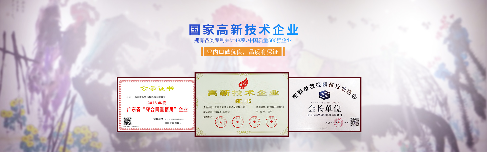新望機(jī)械成立于1998年,位于東莞市東部工業(yè)園區(qū)的中心地帶——企石鎮(zhèn)東平村,交通方便、環(huán)境優(yōu)美舒適、視野開(kāi)闊。公司注冊(cè)資本2000萬(wàn)元,擁有辦公室、廠房等18,000多平方米。已通過(guò)ISO9001:2015國(guó)際質(zhì)量管理體系認(rèn)證,擁有國(guó)家各類(lèi)專利共計(jì)58項(xiàng)。是東莞市企石鎮(zhèn)工商聯(lián)副會(huì)長(zhǎng)單位、東莞市企石鎮(zhèn)文學(xué)藝術(shù)界聯(lián)合會(huì)副主席單位、東莞市環(huán)保包裝行業(yè)協(xié)會(huì)副會(huì)長(zhǎng)單位、東莞市數(shù)控裝備行業(yè)協(xié)會(huì)第二屆會(huì)長(zhǎng)單位、廣東省包裝技術(shù)協(xié)會(huì)常務(wù)理事單位、廣東省膠粘劑行業(yè)協(xié)會(huì)理事單位、廣東省著名商標(biāo)企業(yè)、國(guó)家高新技術(shù)企業(yè)。